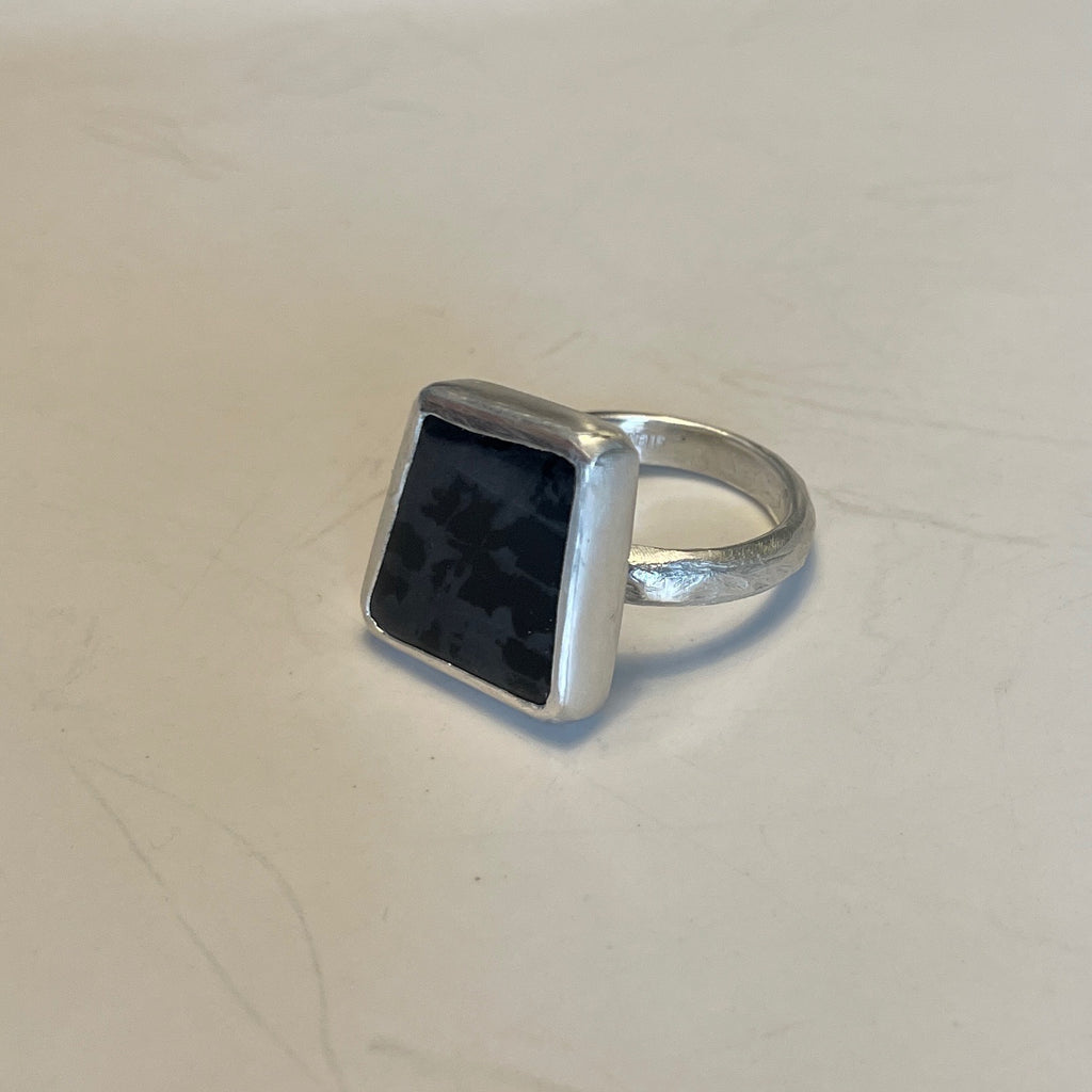 House cut black onyx sets in texture sterling silver band. Stone is natural and has natural marking of grey and black. Stone is shaped in uneven trapeze and Approx. 1.5 cm on its longer side. Size 8.5
