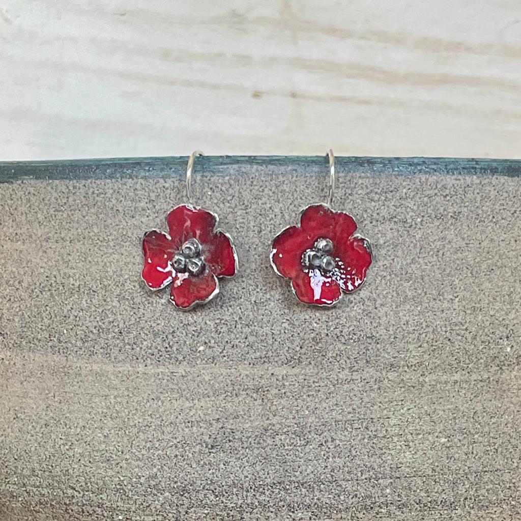 Silver poppy earrings with red enamel. Flower is about 3/4 " with silver hooks.