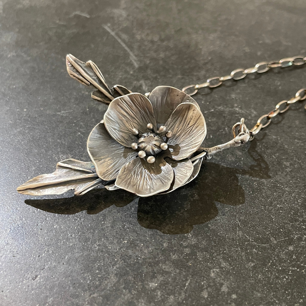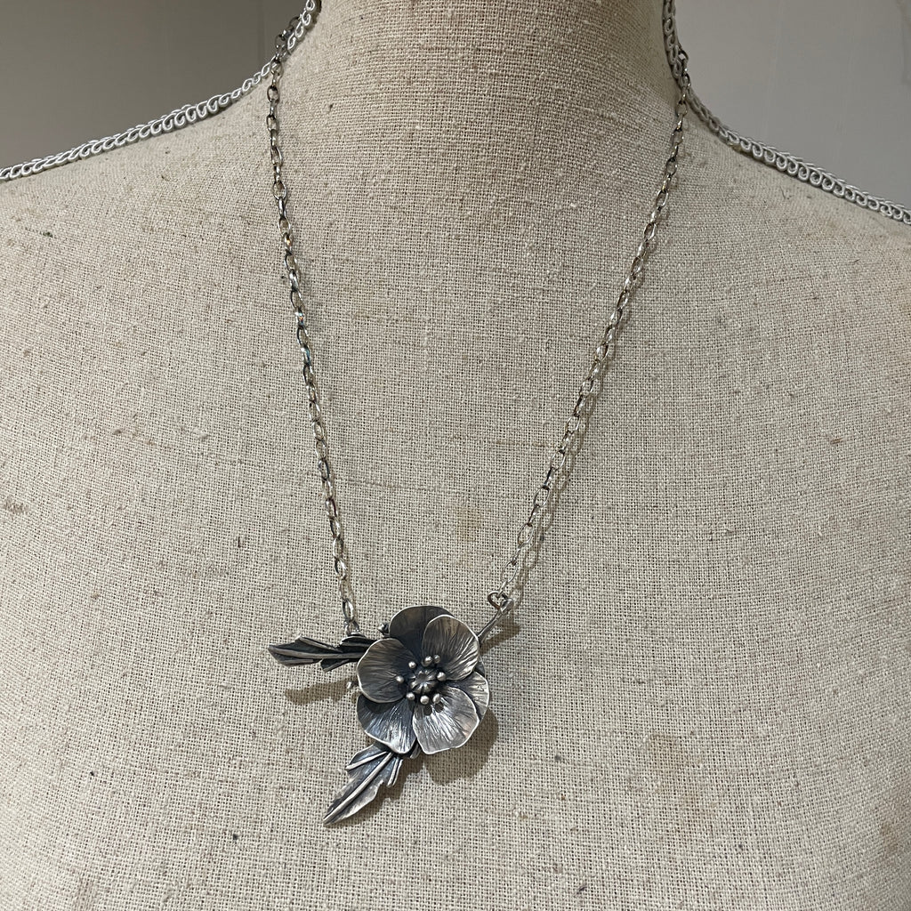 Hand made one of a kind poppy flower with 2 leaves and a branch. Silver with oxidised finish. One of a kind nature inspired artwork ,suspended from a 18 in chain.