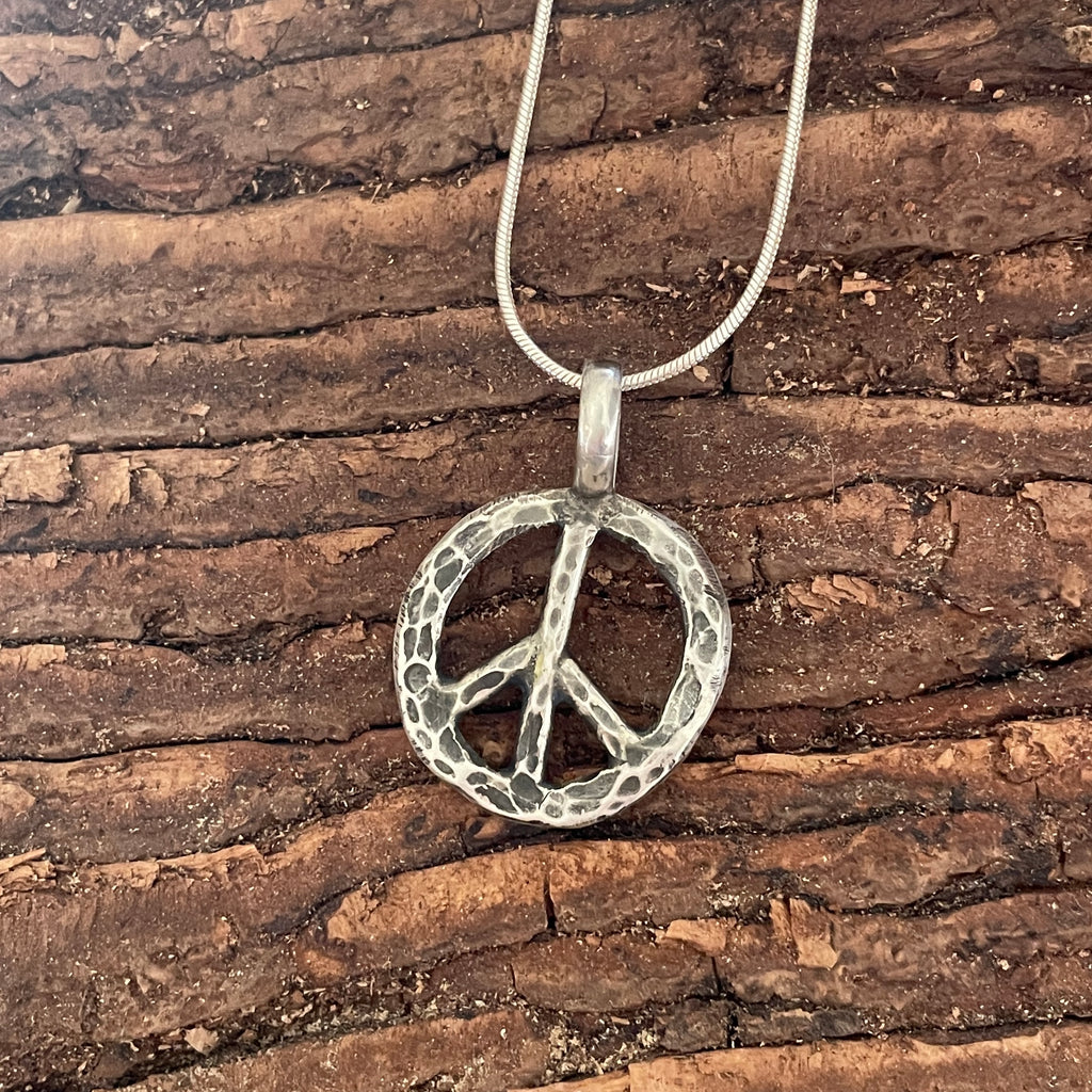 Hand made hammered and oxidised peace pendant suspended from either 18 or 20 inch chain.When out of stock we will make it for you. This item is is not a cast and pendant will vary in look.