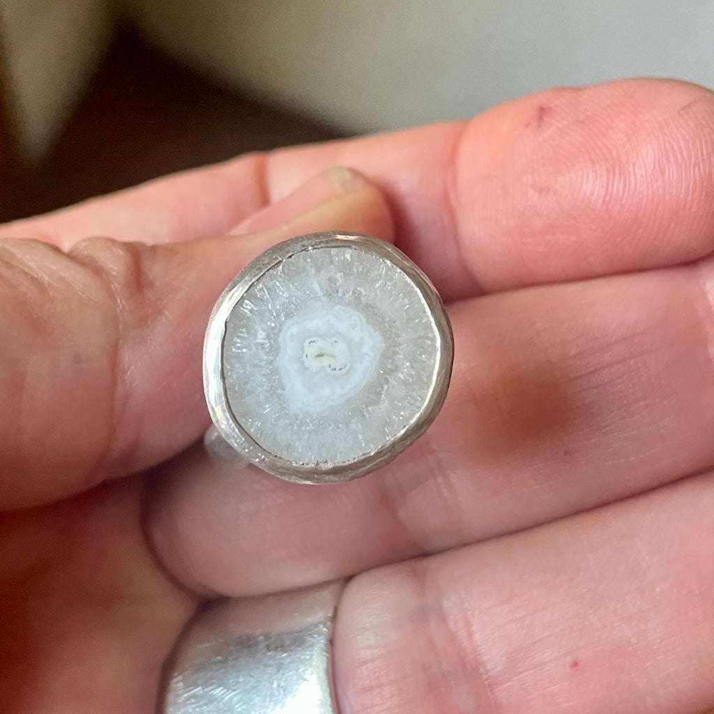 solar quartz and silver ring features a soft texture and an oxidised finish, highlighting the milky tones of its unique three disc solar quartz design. Size 8